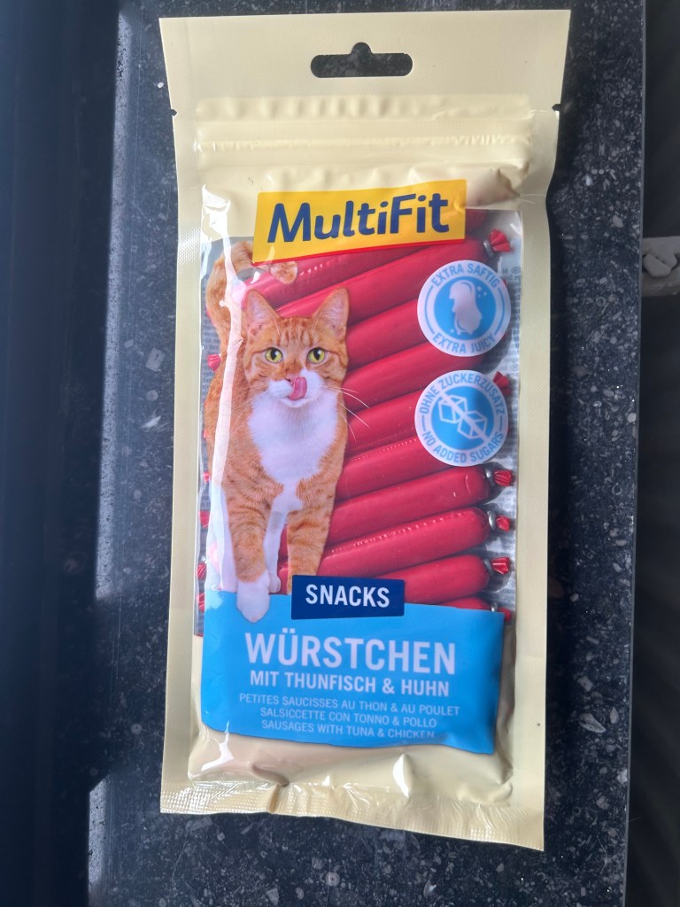 Sushi e Panterino hanno provato per voi le salsiccette al tonno della marca MultiFit, ben tre confezioni, comprate sul sito di Maxi Zoo.