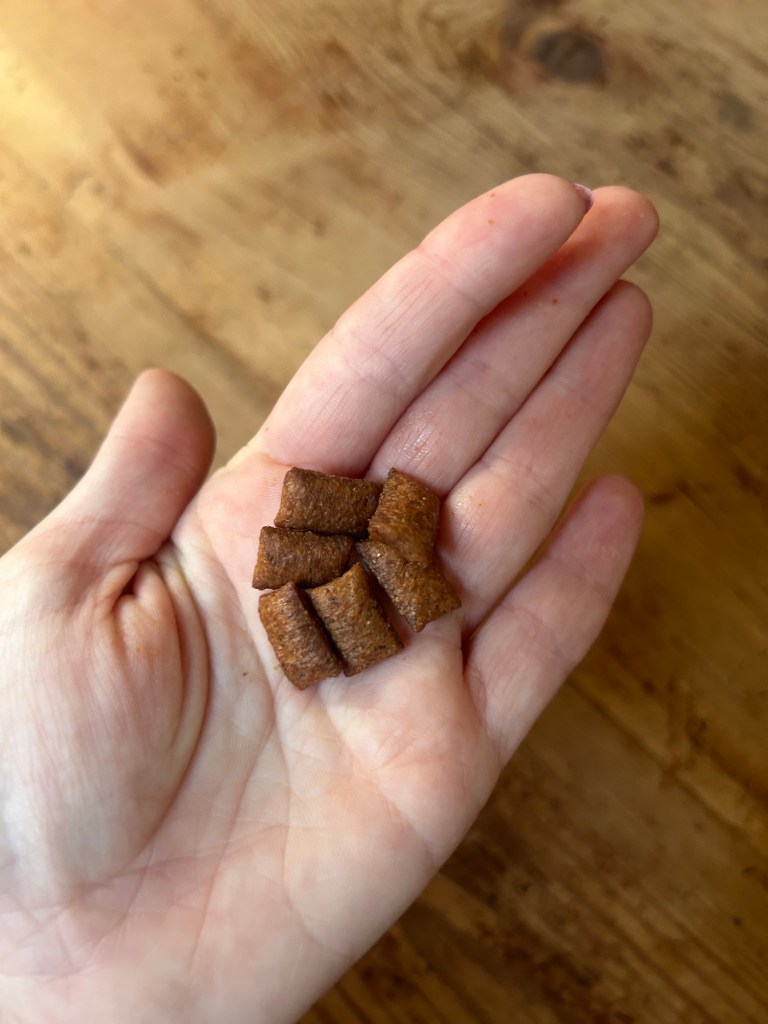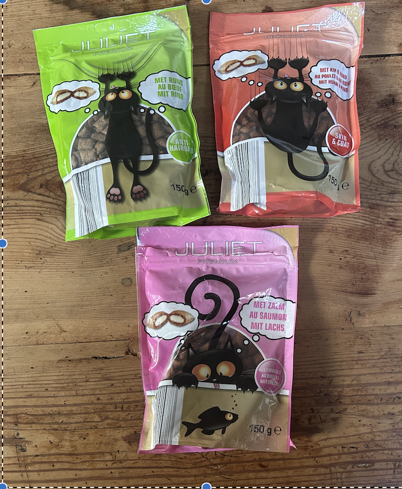 PRO: sono abbastanza gustosi e i miei gatti li approvano anche perchè ne esistono 4 varianti, quindi c’è la possibilità di cambiare. Sono molto economici e facilemente reperibili (almeno in Belgio) da Aldi. Durano a lungo perchè le buste sono da 150 gr.
